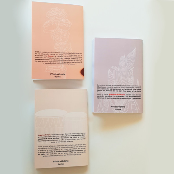Pack tres libretas A5 Viva la Victoria 2020. Ilustraciones sobre la aldea de mujeres en el Kurdistán Sirio ‘Jinwar’, las percisionistas ‘Ngoma Nshya’ de Ruanda y la acción colectiva por el reparto igualitario del territorio #Women2Kilimanjaro. Por un 2019 en el que los logros colectivos de la práctica feminista, los gritos dibujados, la alegría, los colores y victorias nos acompañen y nos inspiren para alcanzar nuevos grandes logros colectivos.
