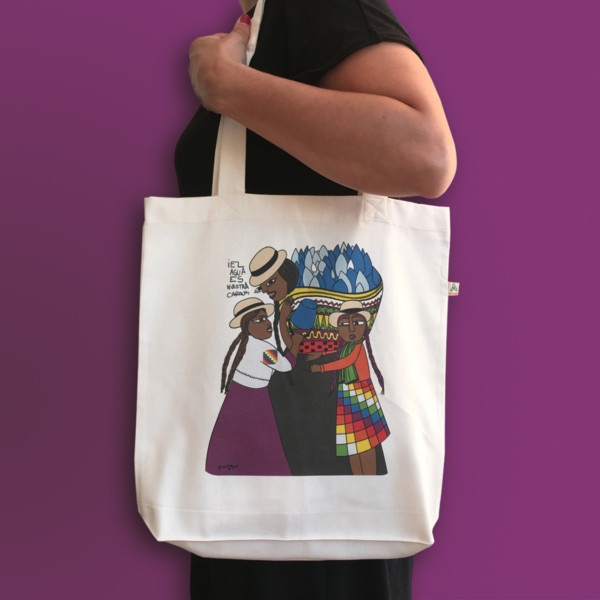 Bolso feminista «Guerra del Agua, Cochabamba». Color blanco natural. Producto 100% algodón orgánico proveniente de comercio justo. Dibujo sobre la unión que hace la fuerza, ilustración sobre el hito histórico de la Guerra del Agua en Cochabamba, Bolivia, ocurrió en el año 2000 y fue una fallida privatización del agua en la que toda la comunidad se alzó para defender el bien común.
