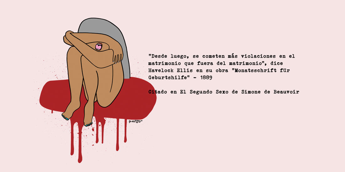La frase elegida por Jara para la ilustración ha sido: «Desde luego, se cometen más violaciones en el matrimonio que fuera del matrimonio», dice Havelock Ellis. En su obra «Monatsschrift für Geburtshilfe» – 1889.